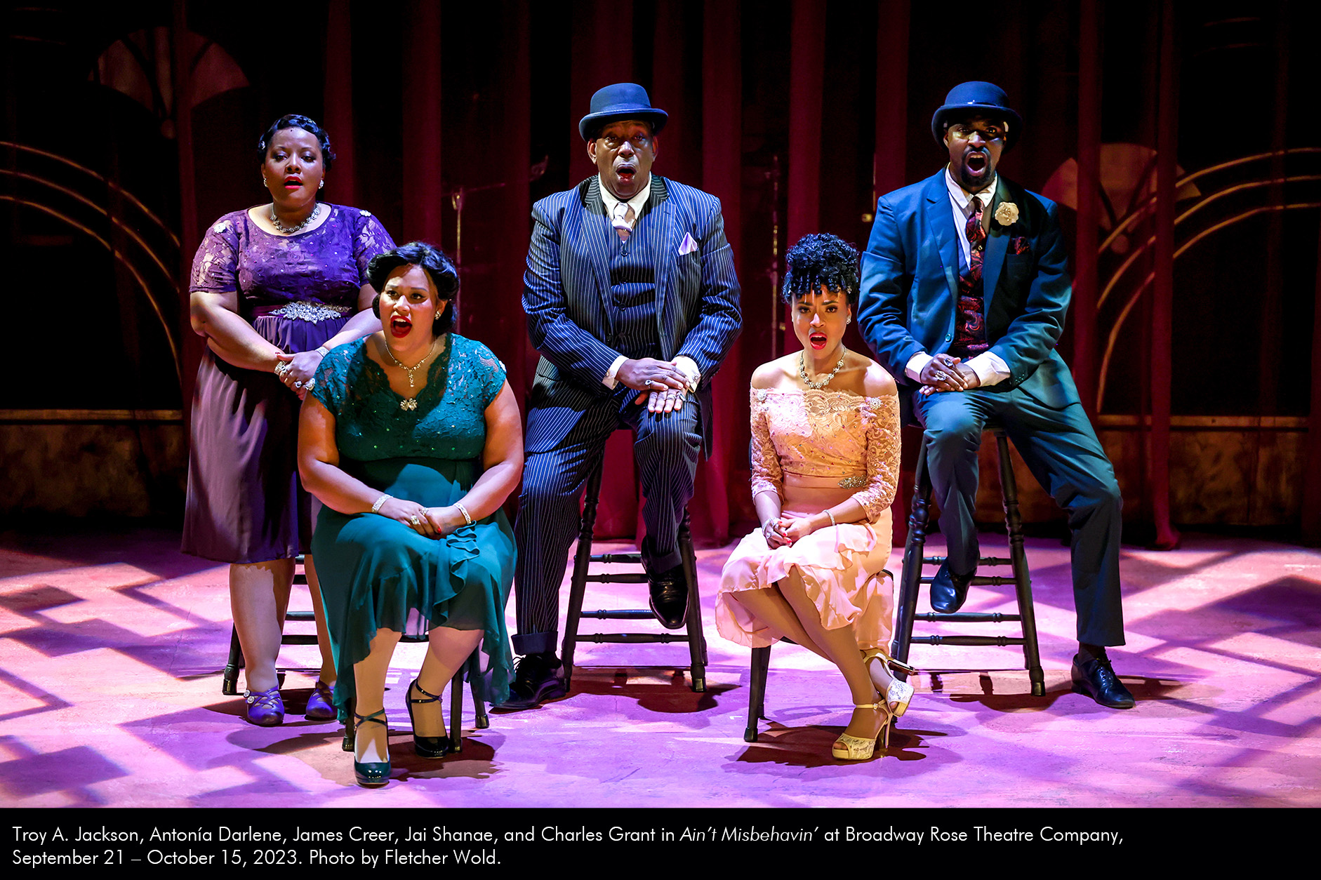 Troy A. Jackson, Antonía Darlene, James Creer, Jai Shane, and Charles Grant in Ain’t Misbehavin’ at Broadway Rose Theatre Company,