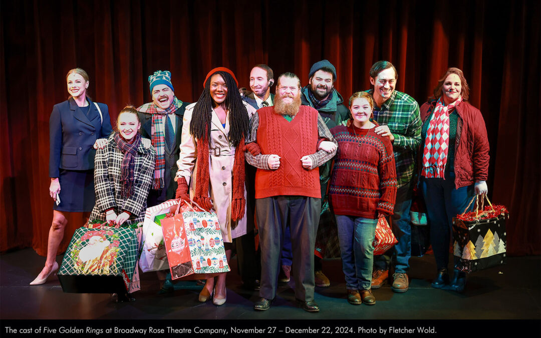 The cast of Five Golden Rings at Broadway Rose Theatre Company, November 27 – December 22, 2024. Photo by Fletcher Wold. by Jared McLean | Nov 27, 2024