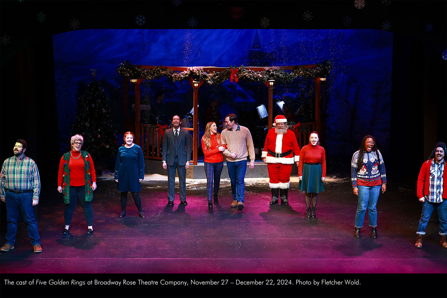 The cast of Five Golden Rings at Broadway Rose Theatre Company, November 27 – December 22, 2024. Photo by Fletcher Wold. by Jared McLean | Nov 27, 2024