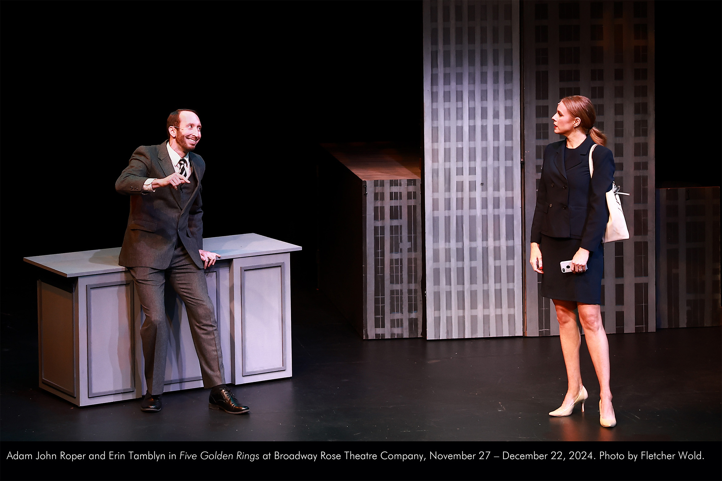Adam John Roper and Erin Tamblyn in Five Golden Rings at Broadway Rose Theatre Company, November 27 – December 22, 2024. Photo by Fletcher Wold. by Jared McLean | Nov 27, 2024