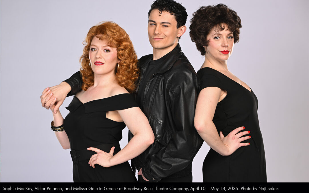 Sophie MacKay, Victor Polanco, and Melissa Gale in Grease at Broadway Rose Theatre Company, April 10 – May 18, 2025. Photo by Naji Saker.