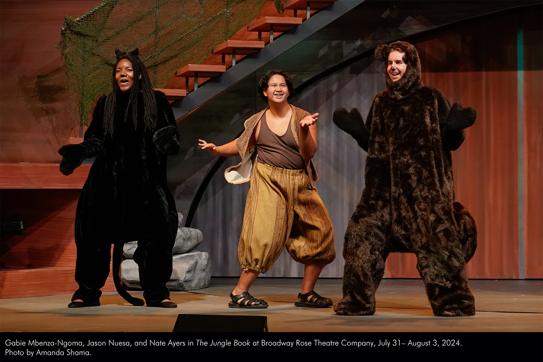 Gabie Mbenza-Ngoma, Jason Nuesa, and Nate Ayers in The Jungle Book at Broadway Rose Theatre Company, July 31 – August 3, 2024. Photo by Amanda Shama. by Jared McLean | Jul 31, 2024