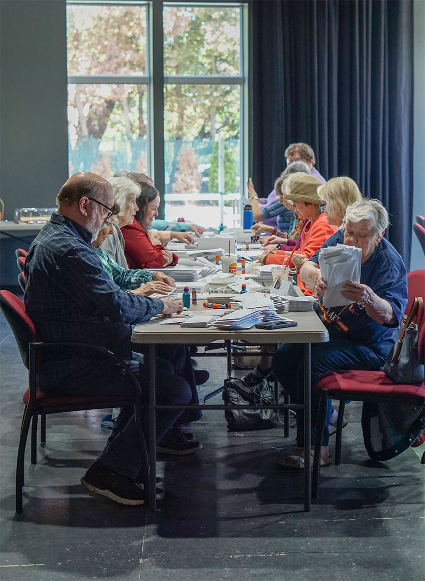 Volunteers helping take care of a bulk mailing project, just one of the ways our volunteers prove themselves an invaluable part of what we do at Broadway Rose