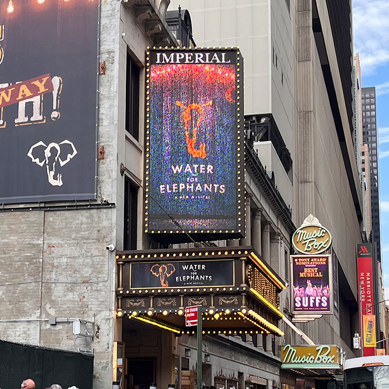 Photo of the marquee and glowing sign for Water For Elephants on Broadway. It is a bright, sunny day in New York City, and the crowds are bustling down the sidewalk.