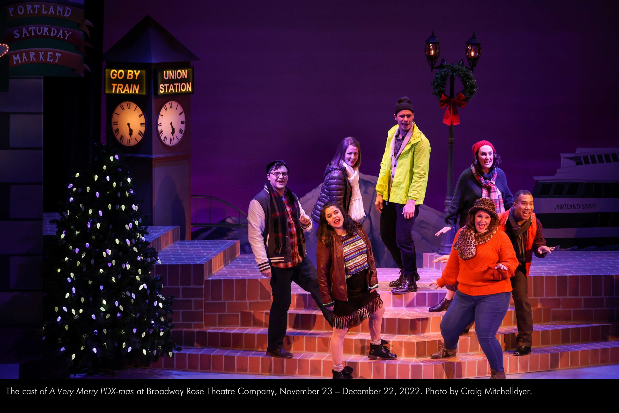 The cast of “A Very Merry PDX-mas” at Broadway Rose Theatre Company, November 23 – December 22, 2022. Photo by Craig Mitchelldyer.