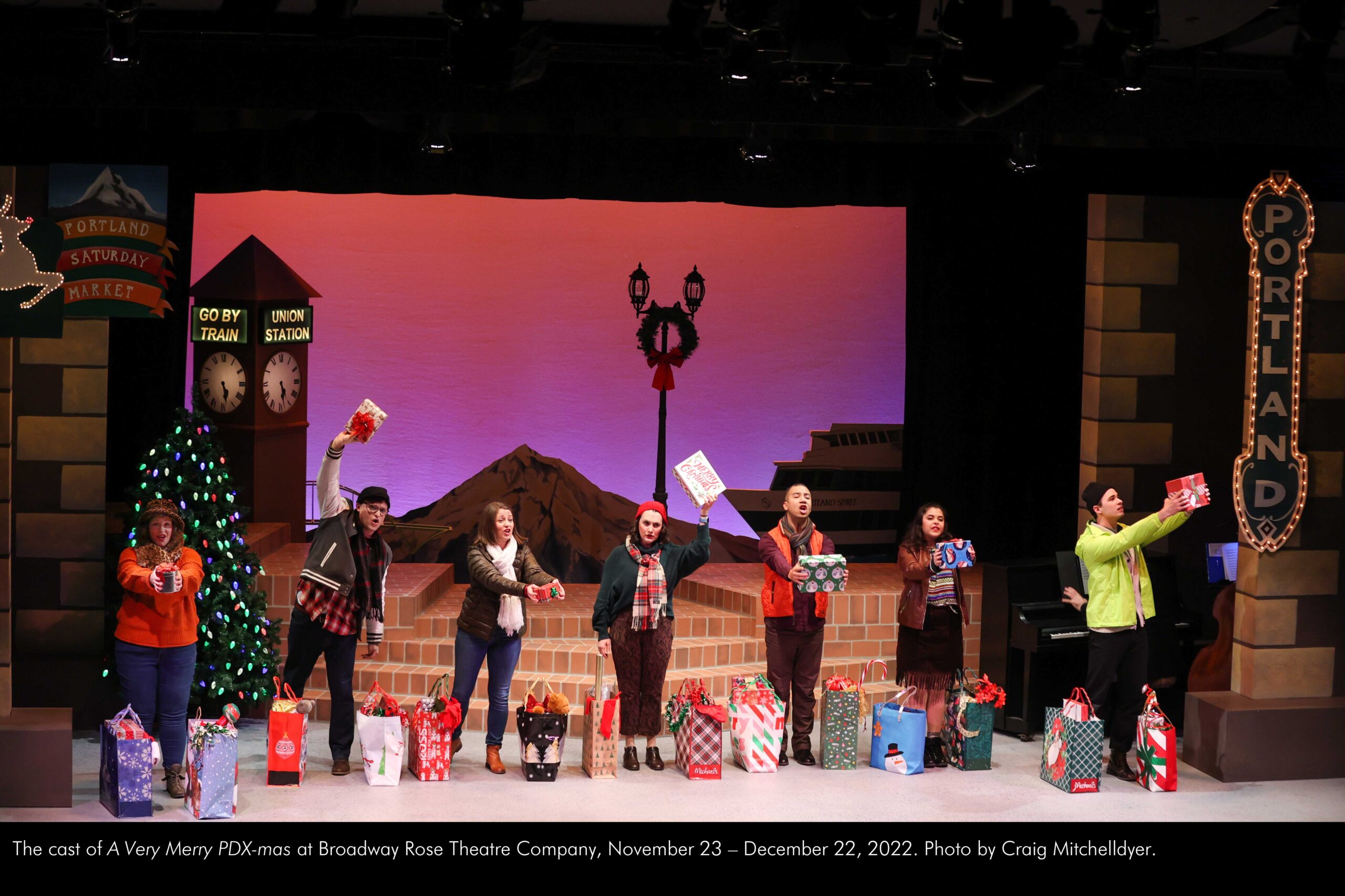 The cast of “A Very Merry PDX-mas” at Broadway Rose Theatre Company, November 23 – December 22, 2022. Photo by Craig Mitchelldyer.