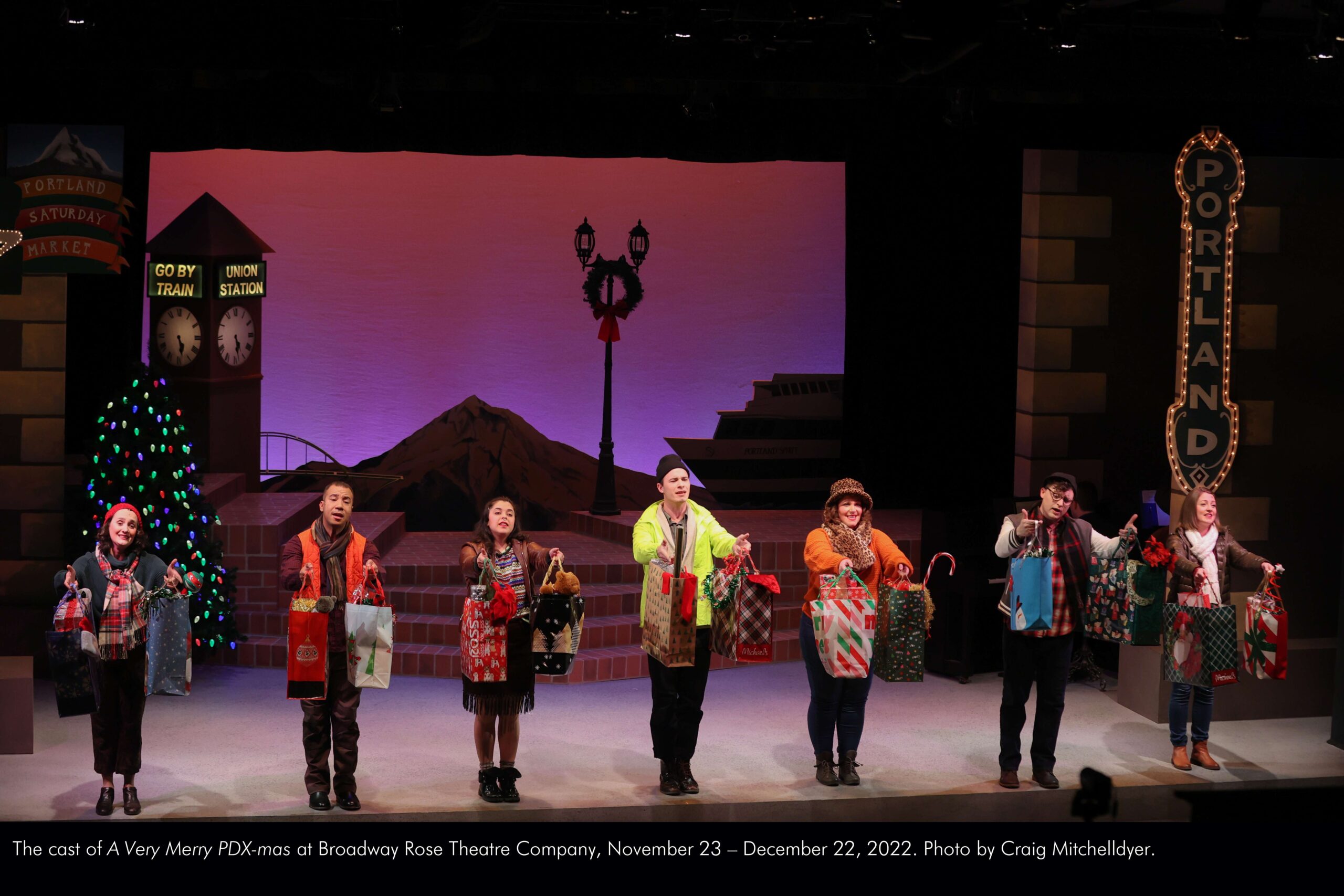 The cast of “A Very Merry PDX-mas” at Broadway Rose Theatre Company, November 23 – December 22, 2022. Photo by Craig Mitchelldyer.
