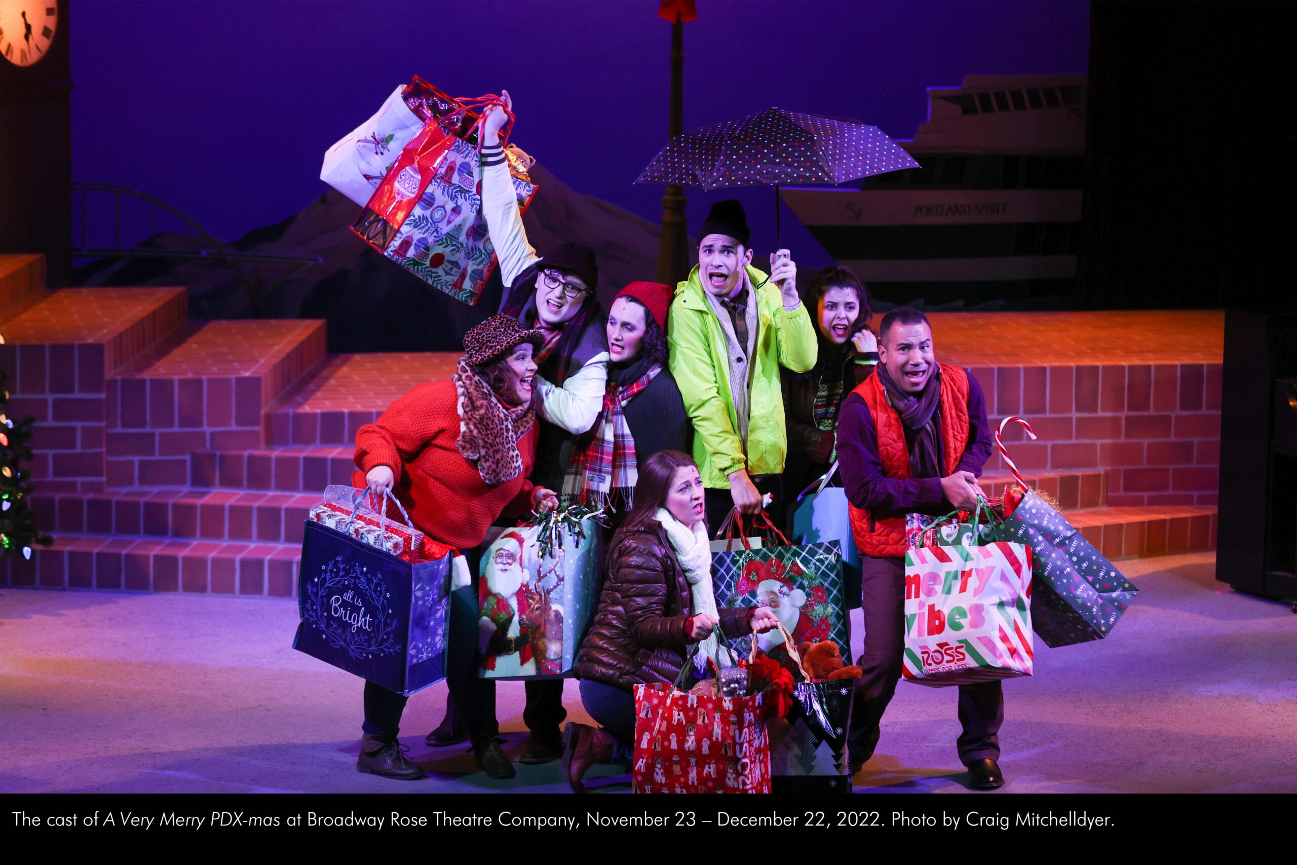 The cast of “A Very Merry PDX-mas” at Broadway Rose Theatre Company, November 23 – December 22, 2022. Photo by Craig Mitchelldyer.