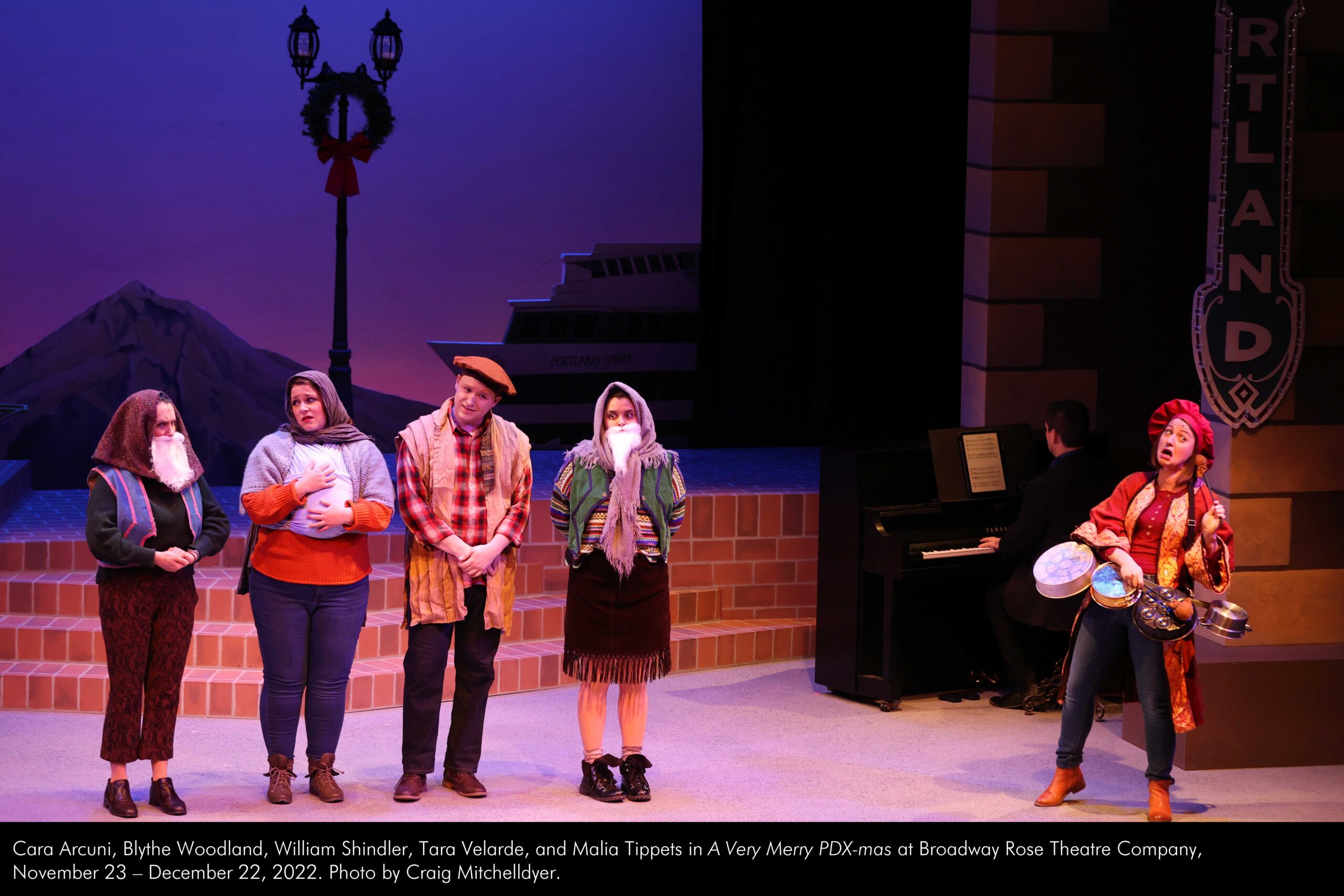 Cara Arcuni, Blythe Woodland, William Shindler, Tara Velarde, and Malia Tippets in “A Very Merry PDX-mas” at Broadway Rose Theatre Company, November 23 – December 22, 2022. Photo by Craig Mitchelldyer.