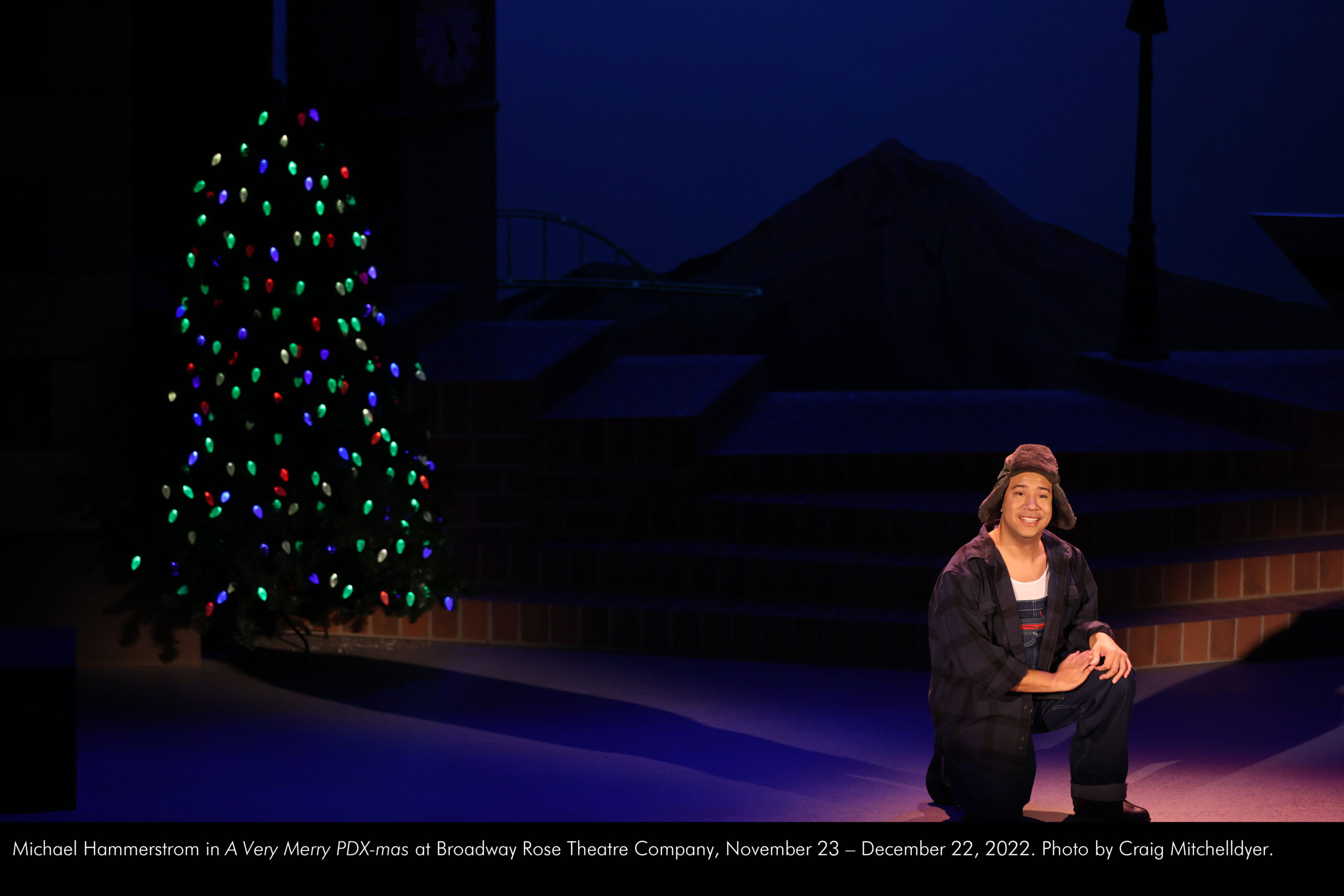 Michael Hammerstrom in “A Very Merry PDX-mas” at Broadway Rose Theatre Company, November 23 – December 22, 2022. Photo by Craig Mitchelldyer.