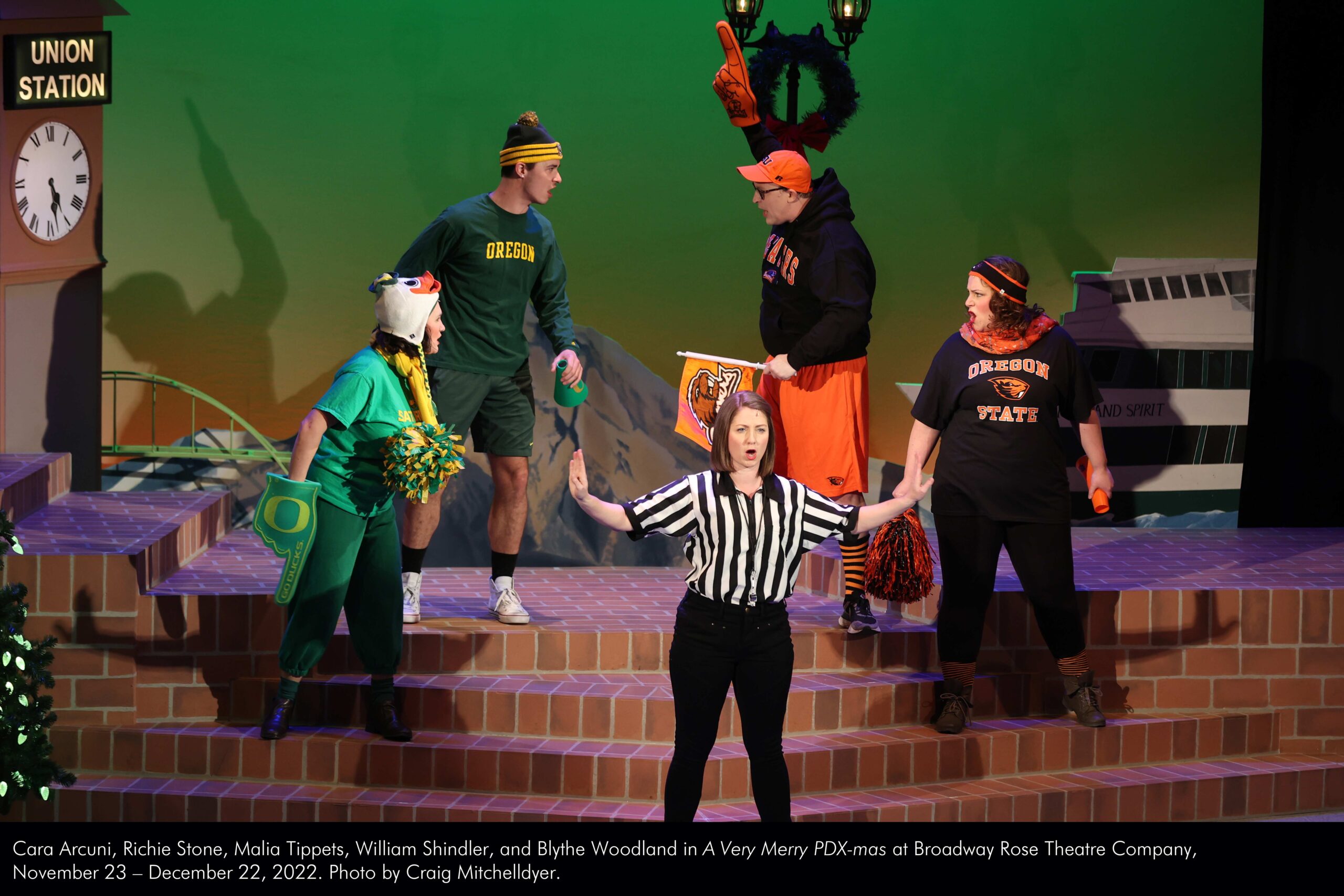 Cara Arcuni, Richie Stone, Malia Tippets, William Shindler, and Blythe Woodland in “A Very Merry PDX-mas” at Broadway Rose Theatre Company, November 23 – December 22, 2022. Photo by Craig Mitchelldyer.