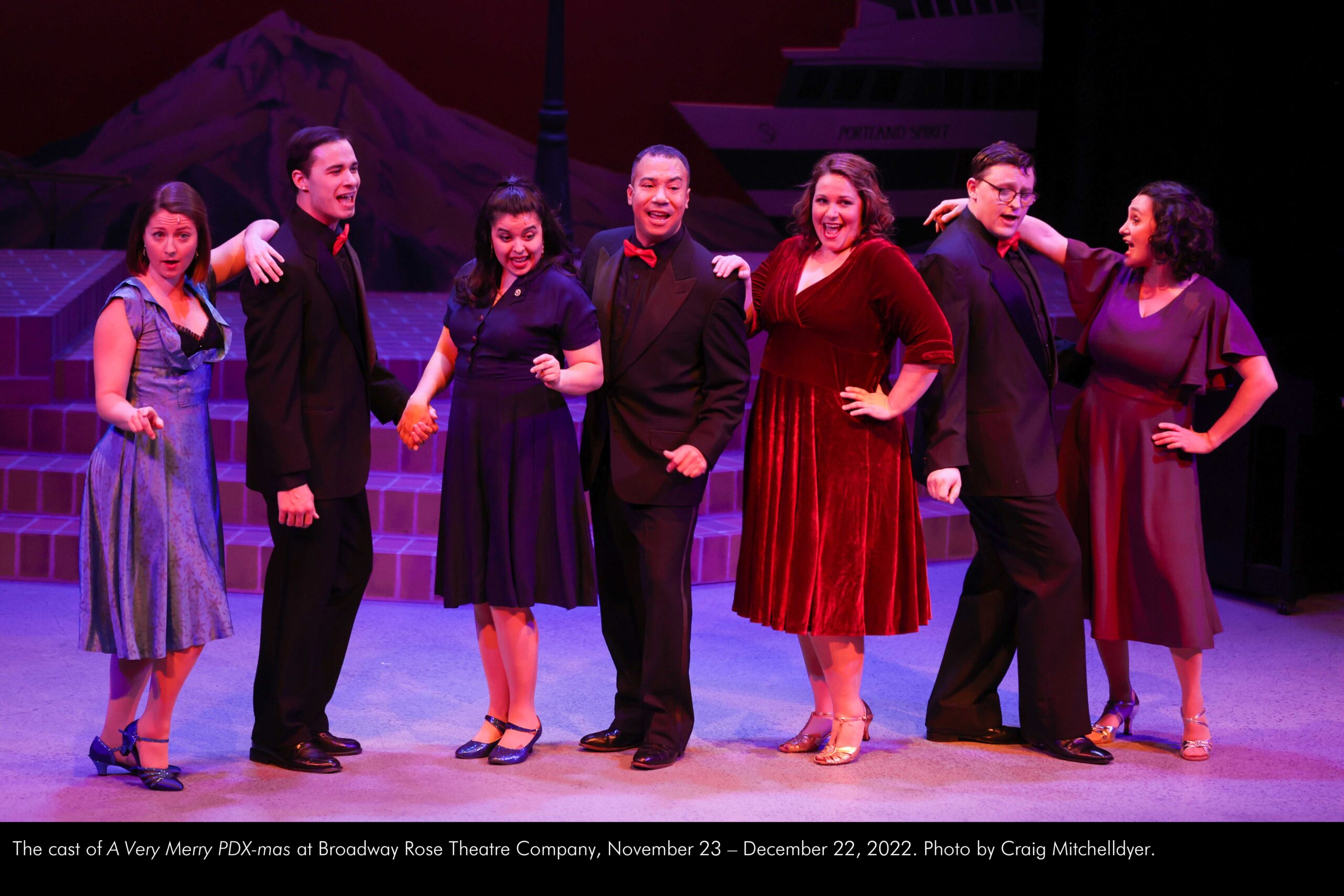 The cast of “A Very Merry PDX-mas” at Broadway Rose Theatre Company, November 23 – December 22, 2022. Photo by Craig Mitchelldyer.