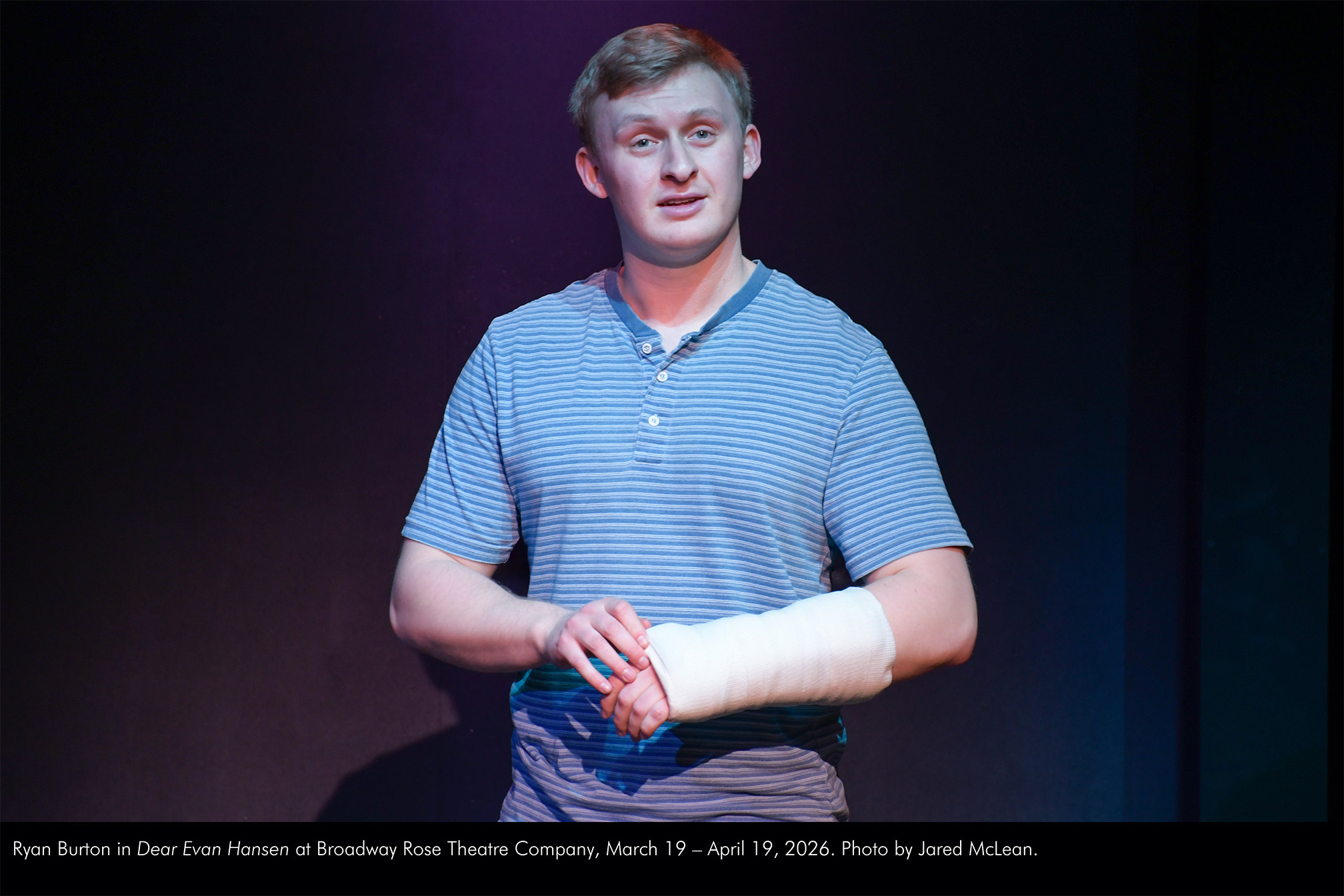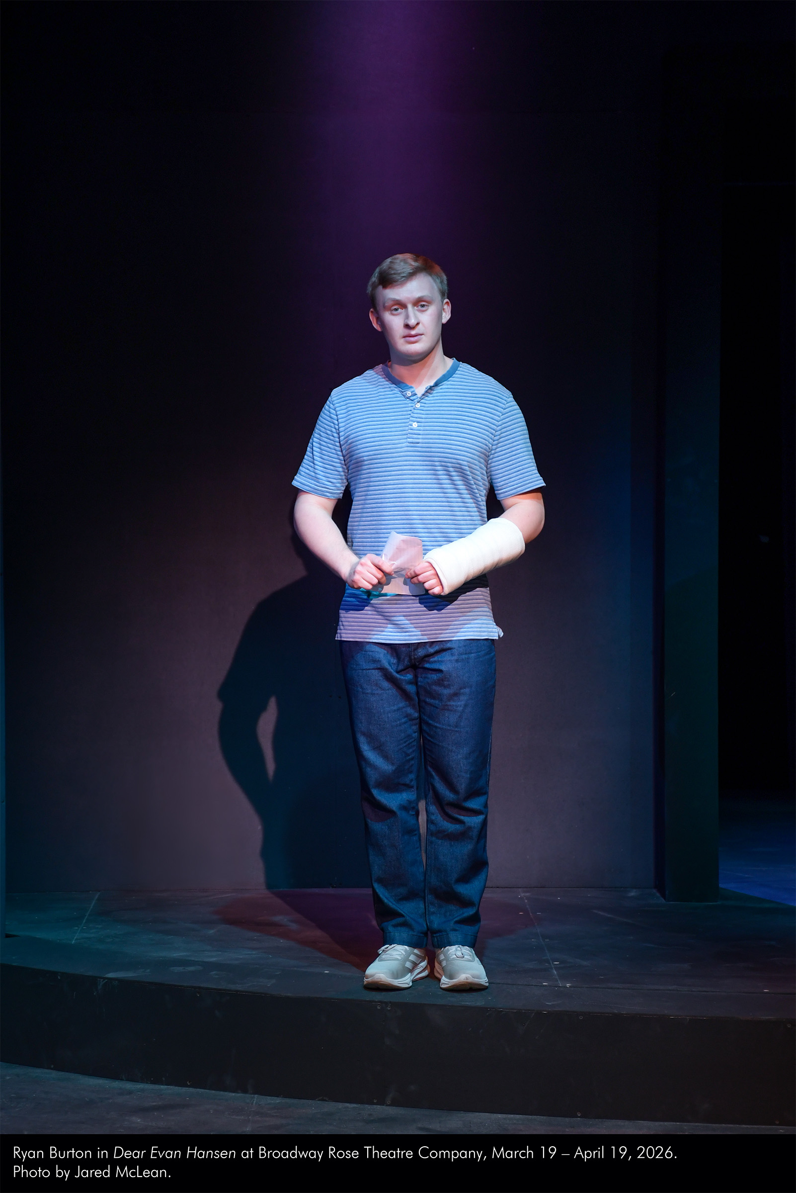 Tigard, OR – Broadway Rose Theatre Company is proud to present Dear Evan Hansen, the Tony and Olivier Award winning musical that reminds us we’re never alone. Preview performance is on Thursday, March 19, with opening night on Friday, March 20, and performances continuing through April 19. Evening performances are Thursday through Saturday at 7:30 p.m. Matinees are at 2:00 p.m. on Saturdays and Sundays. A post-show talkback will be hosted at the Saturday matinee on March 28; audio description is available at the Saturday matinee on April 4. Performances are held at the Broadway Rose New Stage located at 12850 SW Grant Ave. in Tigard.