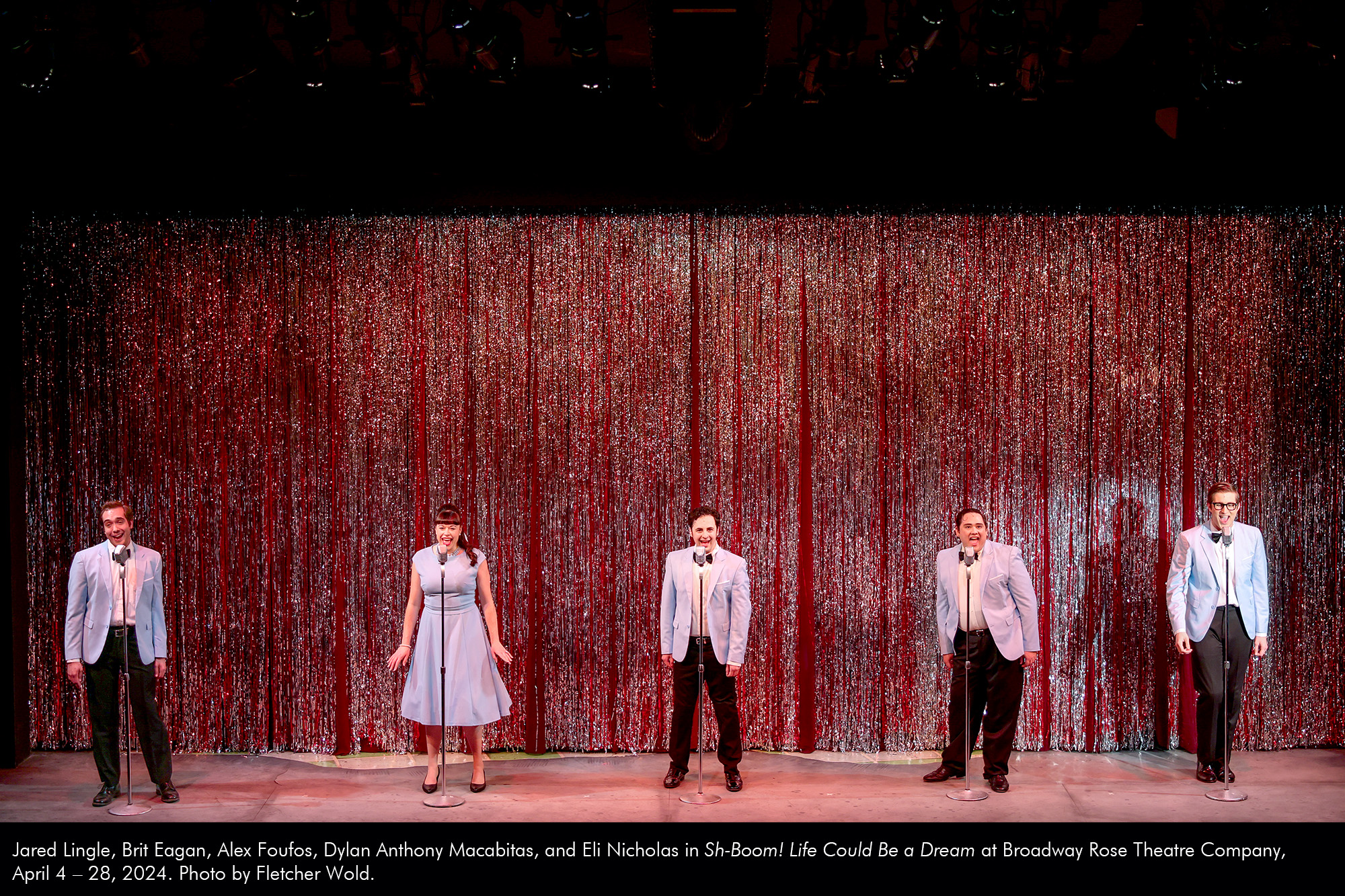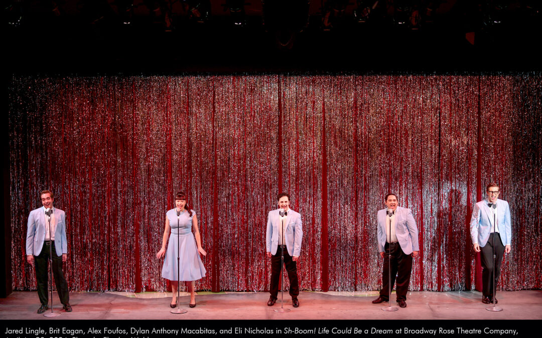 Jared Lingle, Brit Eagan, Alex Foufos, Dylan Anthony Macabitas, and Eli Nicholas in Sh-Boom! Life Could Be a Dream at Broadway Rose Theatre Company, April 4 – 28, 2024. Photo by Fletcher Wold. by Jared McLean | Apr 29, 2024